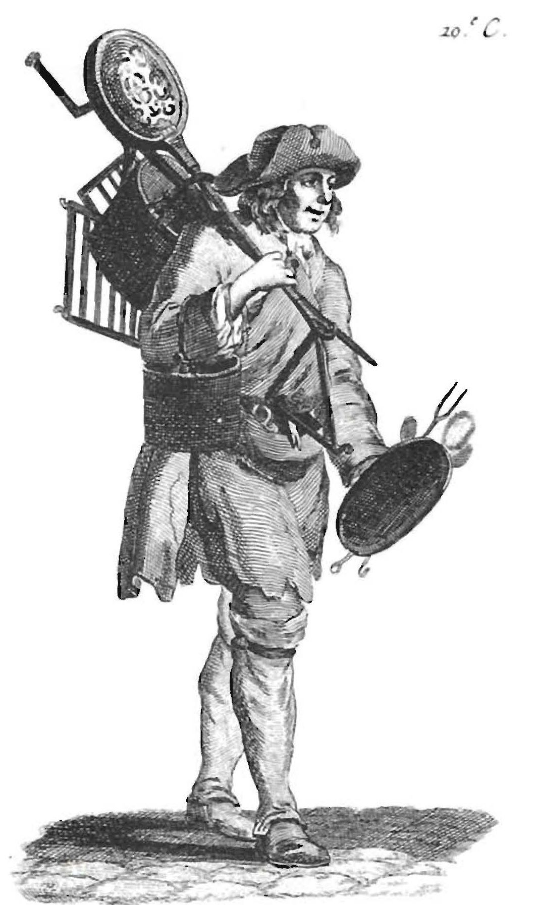 Straßenhändler mit Herdgerät und einer Bettpfanne über der Schulter. ( Kupferstich 57)